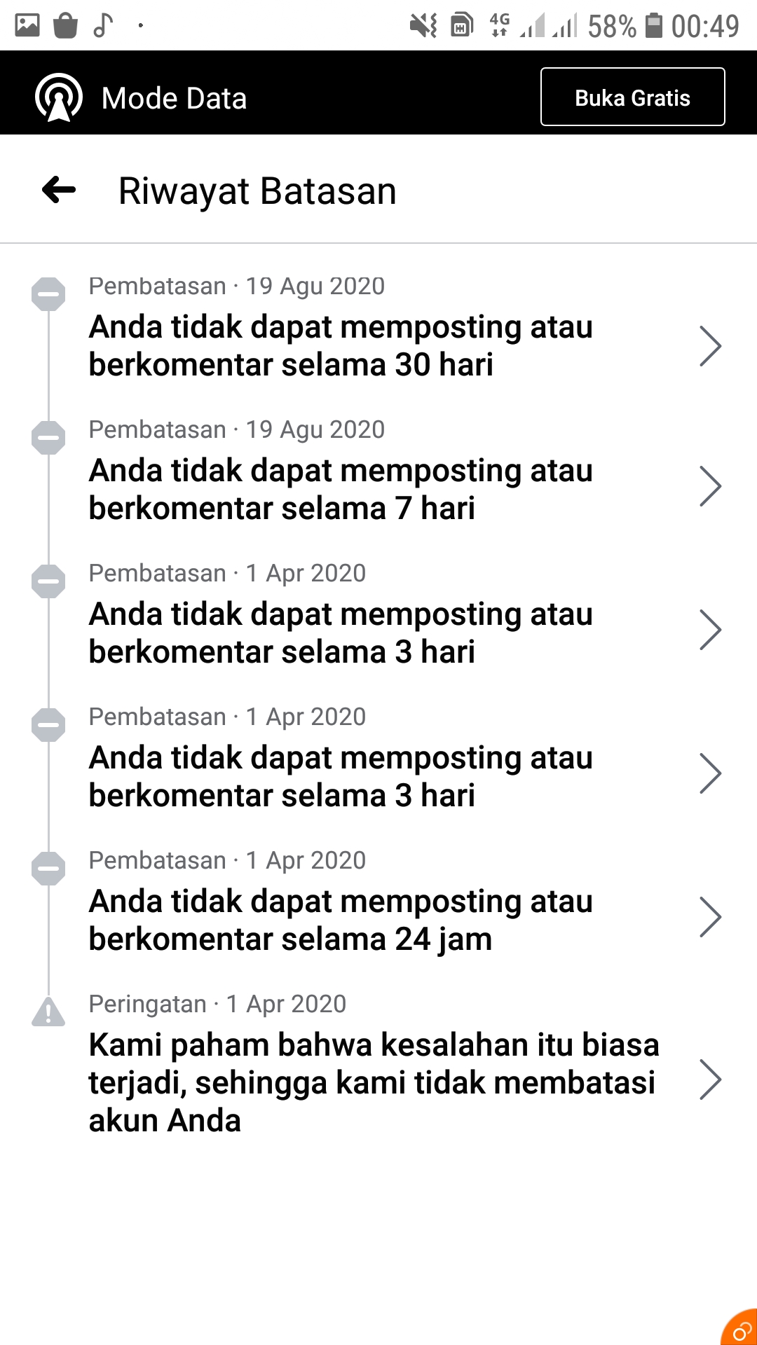 - Terakhir jika anda sudah pernah mendapat pembatasan akun anda bisa lihat riwayat batasan dengan meng-klik menu 3 garis kecil di sebelah kiri bawah,